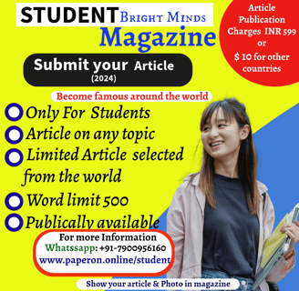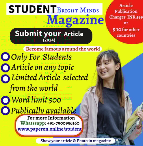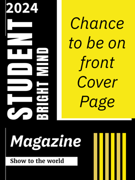 "STUDENT Bright Mind Magazine offers students the chance to gain popularity and showcase their writing talent to the world. With a variety of topics available for one-page articles accompanied by your photo, your selected pieces will be published in our magazine, amplifying your presence and impact in the writing community."